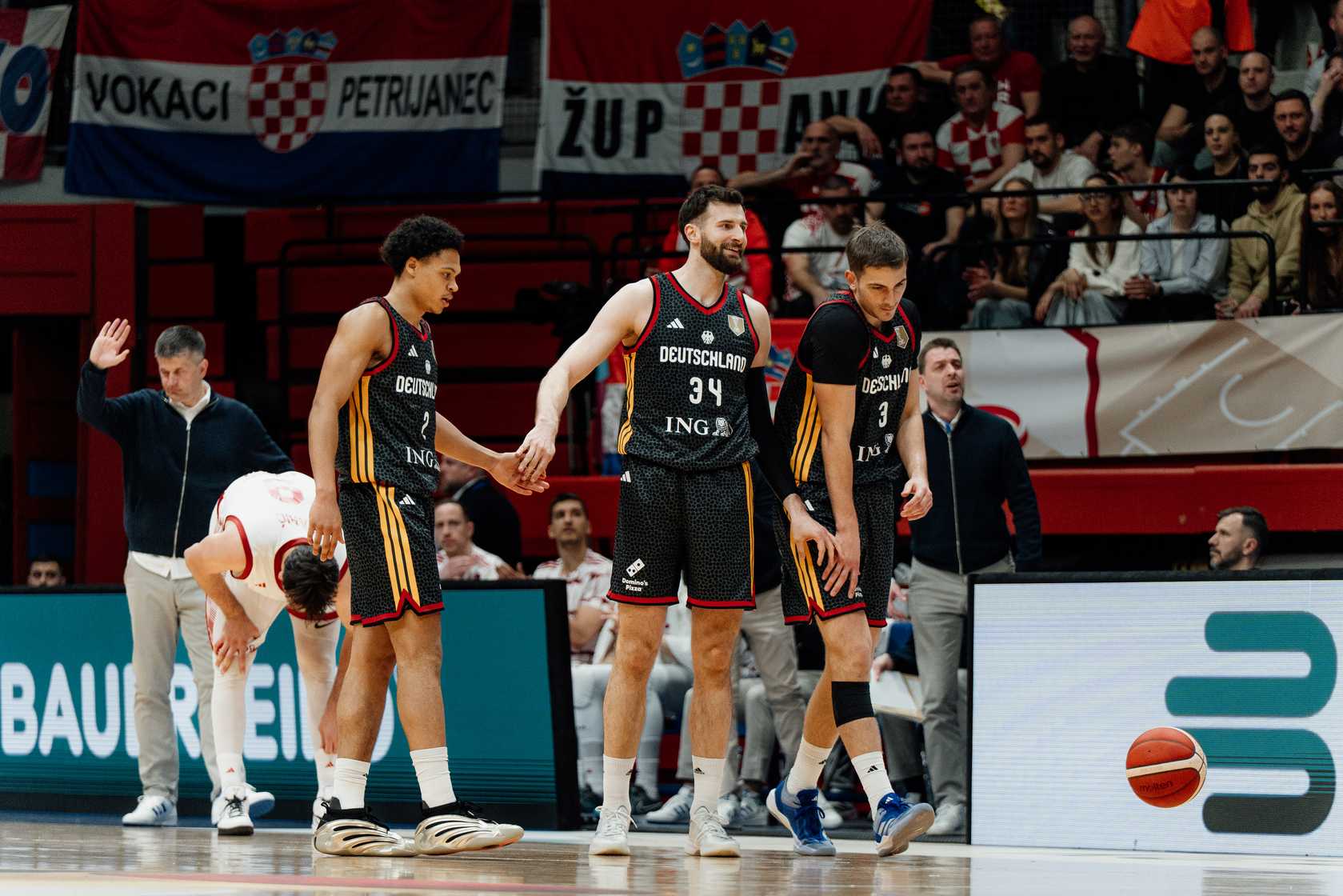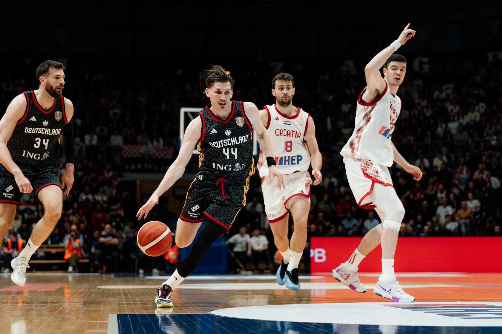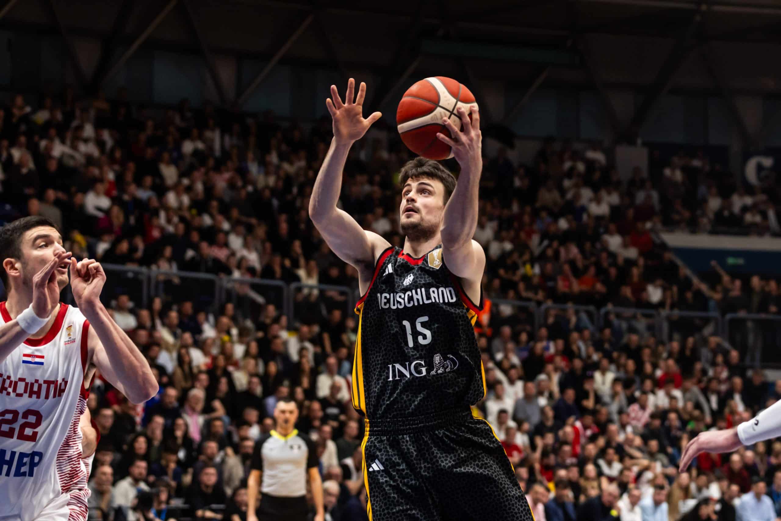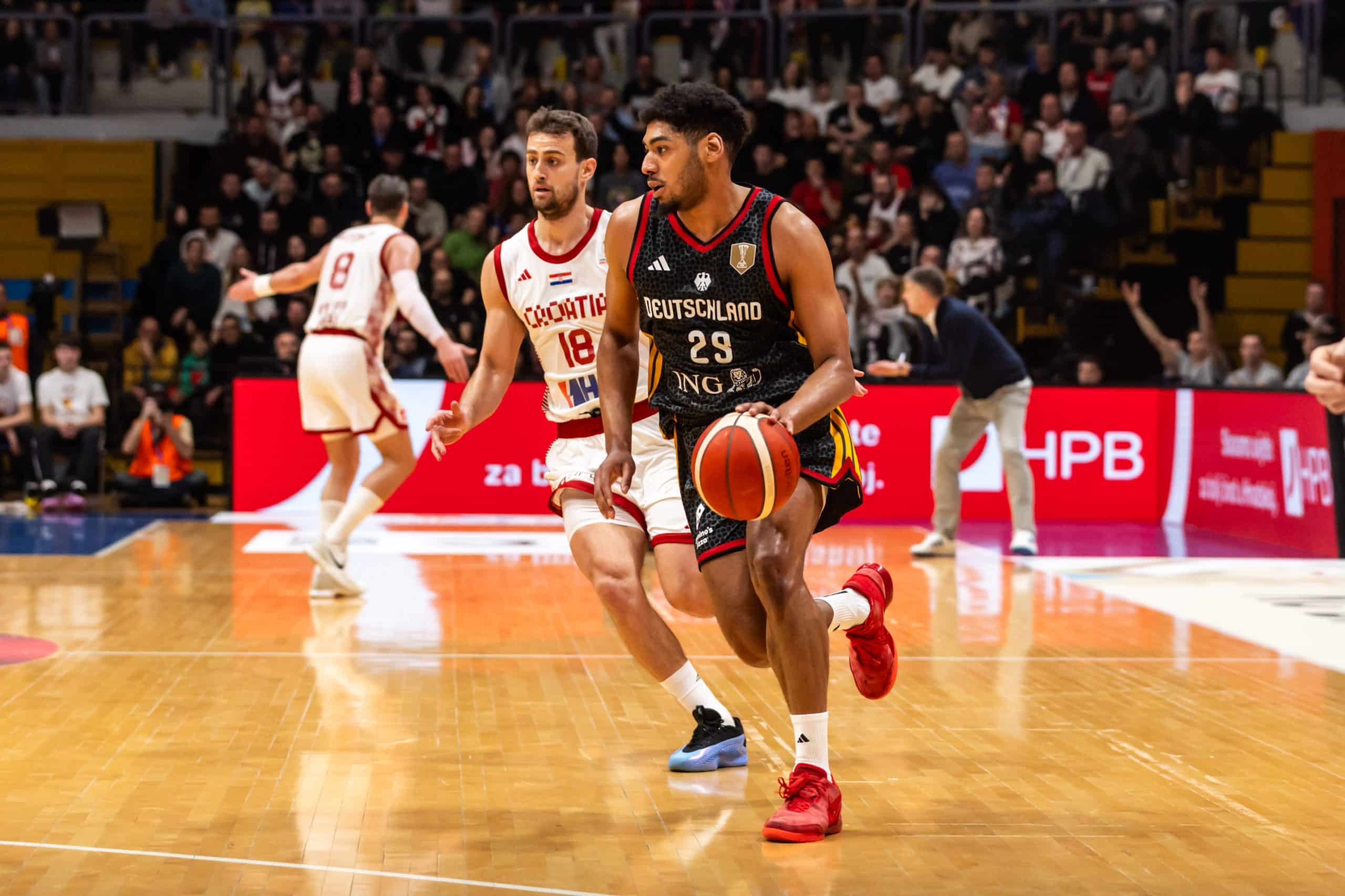 Große AnspannungBei den Kroaten standen deren Stars Mario Hezonja (Real Madrid) und Dario Saric (bis Februar in der NBA) im Aufgebot. Dazu u.a. die aus der BBL bekannten Jaleen Smith und Danko Brankovic. Mumbru schickte vor den Augen von DBB-Präsident Ingo Weiss für Deutschland zu Beginn Nelson Weidemann, Malte Delow, Louis Olinde, Christian Sengfelder und Johannes Thiemann aufs Parkett. Man merkte von Beginn an die Anspannung auf beiden Seiten, die Partie begann mit hoher Intensität, aber auch einigen Fehlern. Deutschland leistete sich frühe Ballverluste, die schmerzten (4:7, 4.). David Krämer checkte mit einem Dreier zum 9:9 ein und legte kurz später zum 12:11 nach (6.). Olinde rackerte für zwei und holte mehrere verlorene Bälle zurück. Jack Kayil netzte für drei zum 15:14 (7.), es war ein munterer Schlagabtausch. „Ein atemloses Auftaktviertel“, wie es TV-Kommentator Benni Zander formulierte, nahm seinen Lauf (23:20, 10.). Mit der Sirene punktete Delow per Dreier zum 26:20.